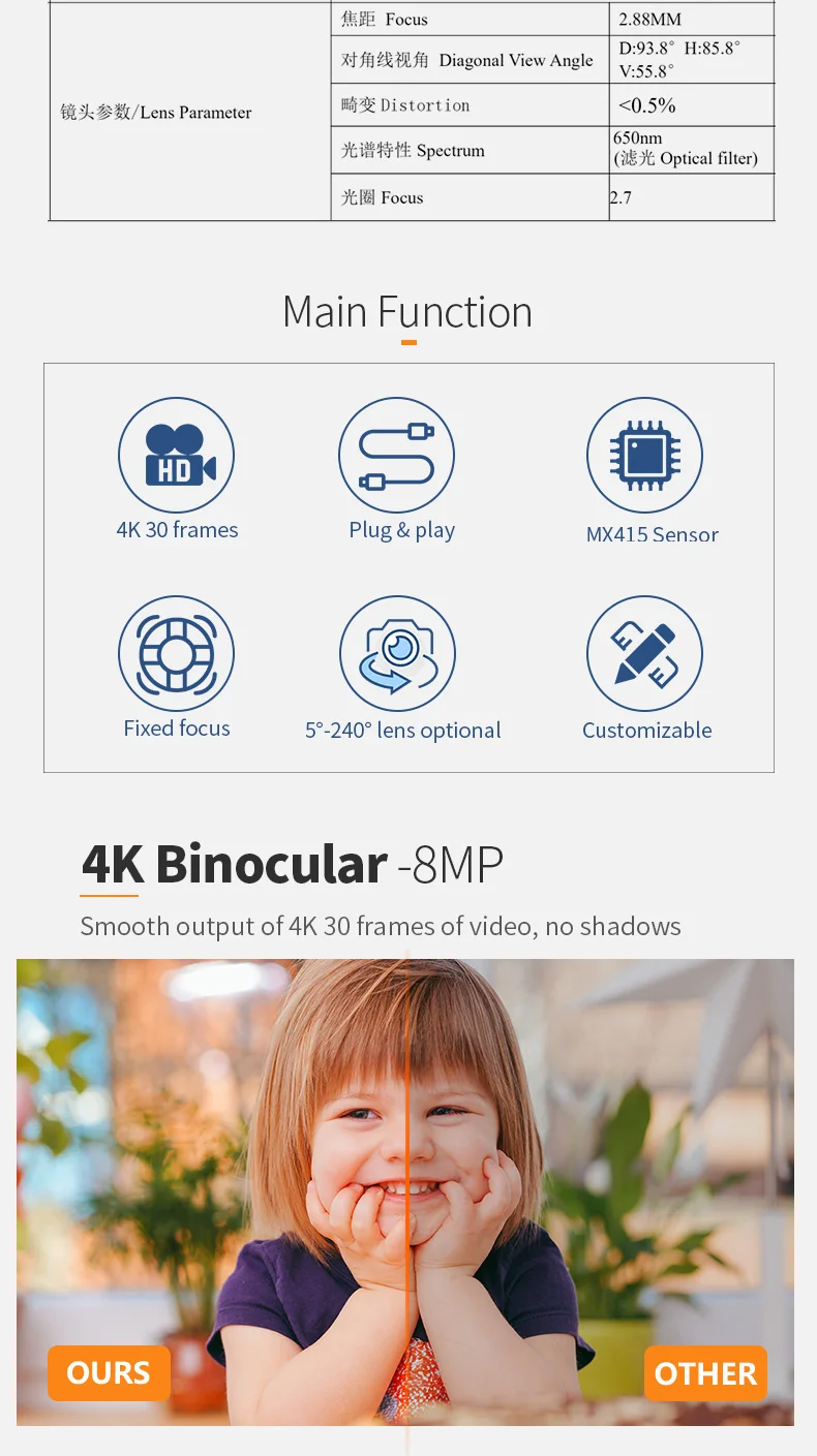 Sensor:Dual IMX415(1/2.8″)CMOS